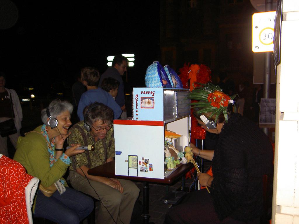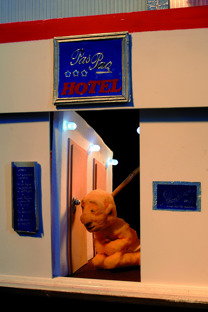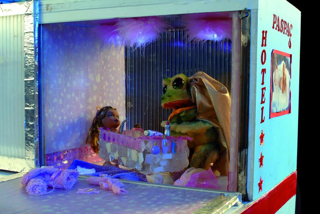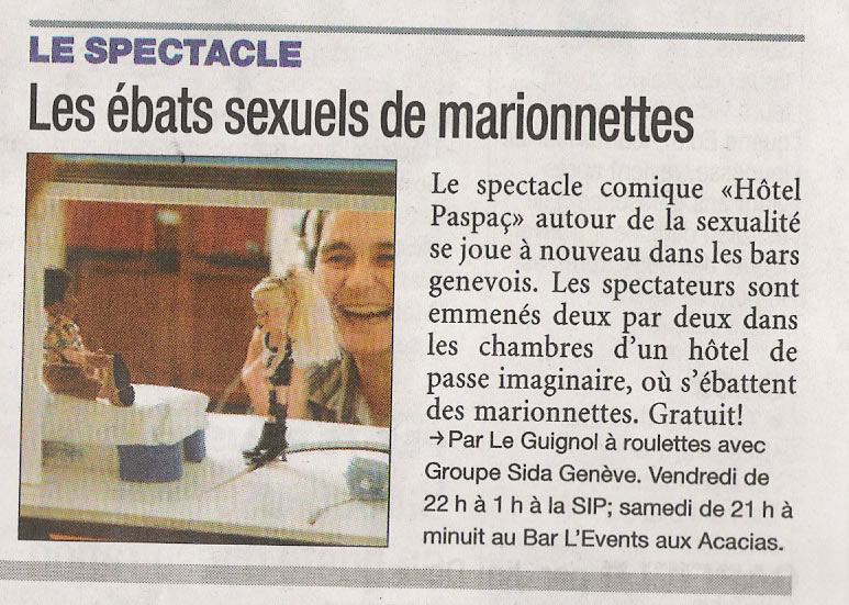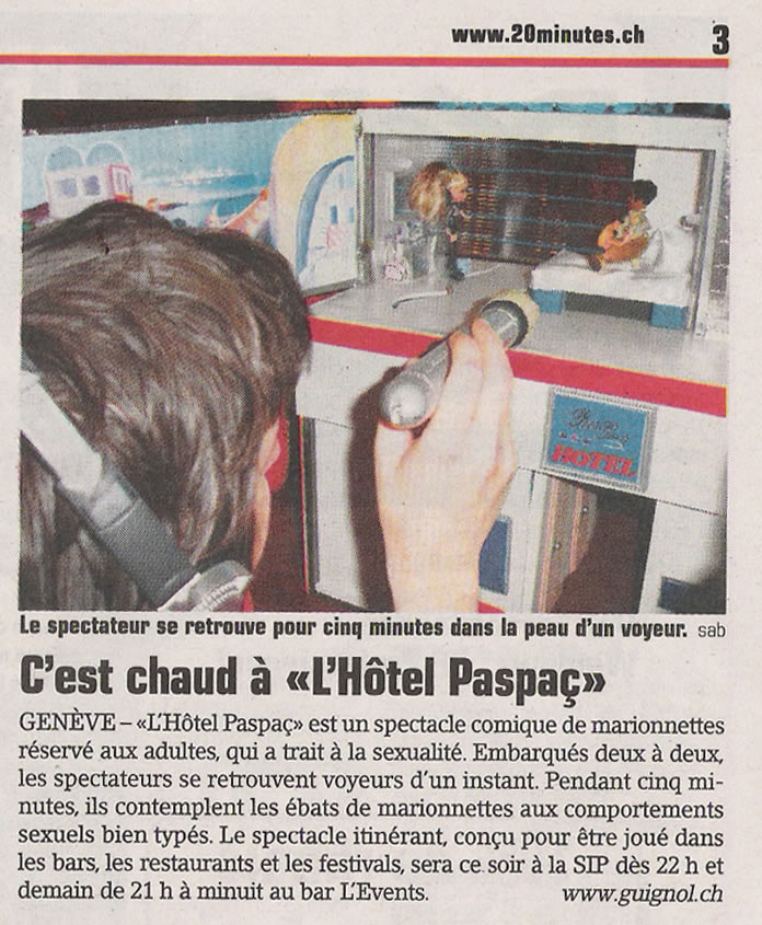 Léger et mobile, « Hôtel Paspaç » est un spectacle comique pour adultes, conçu pour être joué dans les bars, les restaurants, les festivals… Autour d’un entre-et-sort de 5 minutes pour 20 marionnettes et 2 spectateurs, Felix et Zelda Paspaç animent la soirée sur le thème de la sexualité. L’action se déroule le dimanche après-midi, dans un hôtel dont les chambres abritent les ébats variés de nombreux personnages aux comportements sexuels bien typés. Embarqués deux à deux, les spectateurs se retrouvent voyeurs d’un instant. Ils glissent côte à côte au long des couloirs et des cloisons, apercevant en un clin d’œil l’étonnante variété des genres de l’amour chez la marionnette.