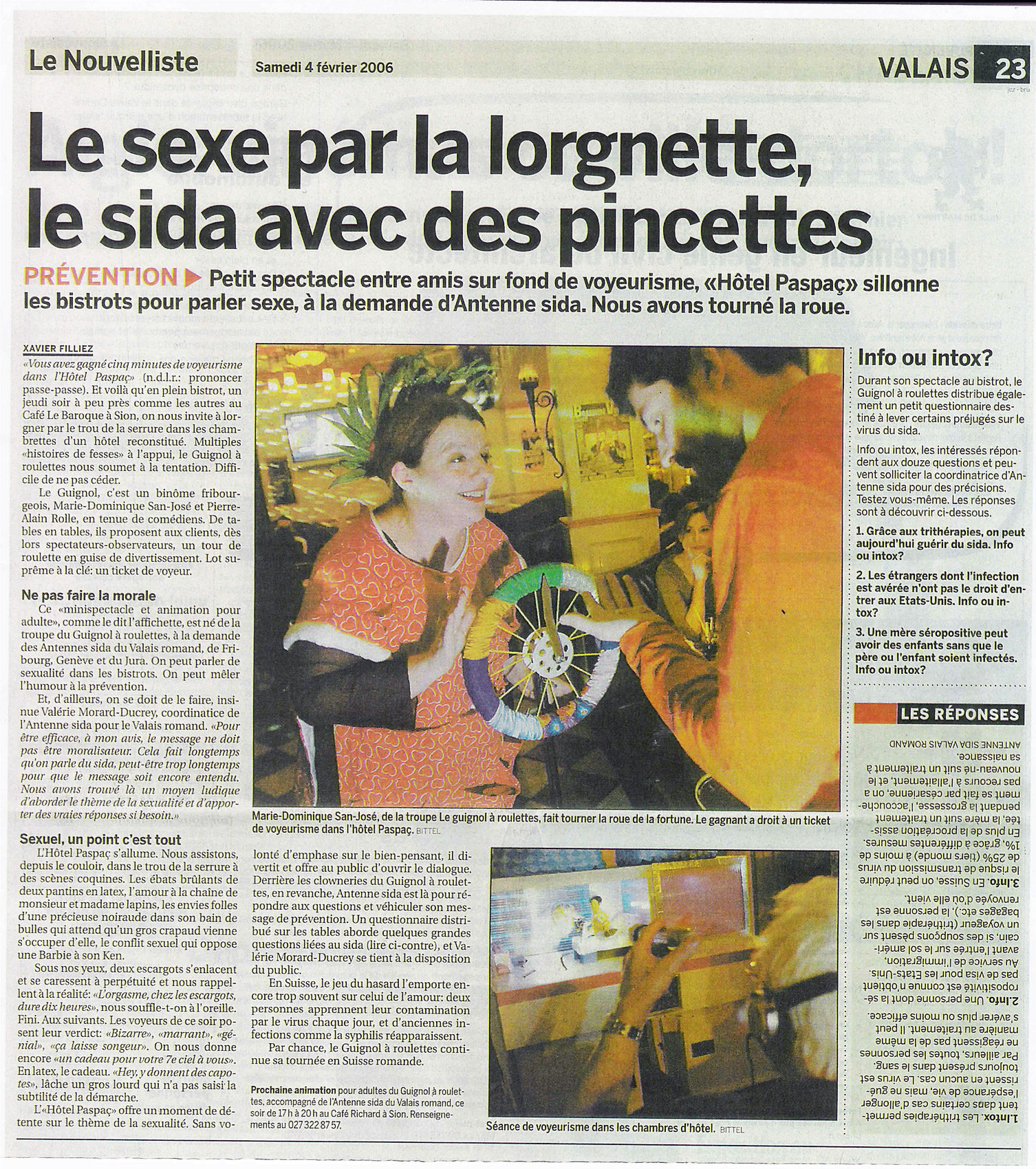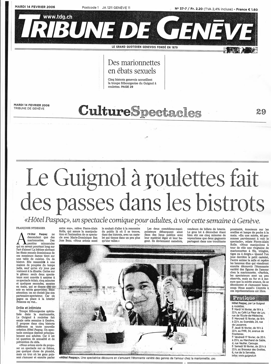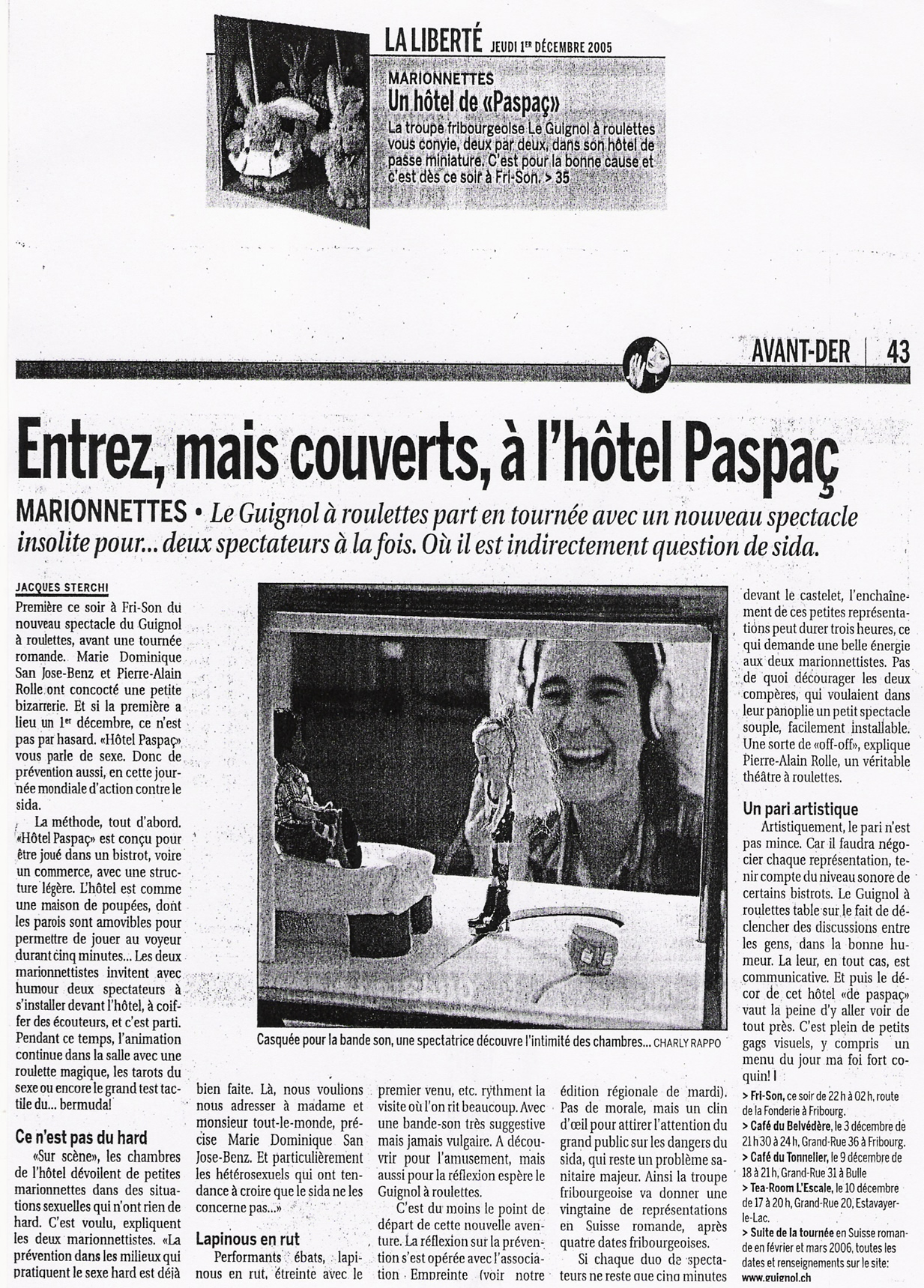 Léger et mobile, « Hôtel Paspaç » est un spectacle comique pour adultes, conçu pour être joué dans les bars, les restaurants, les festivals… Autour d’un entre-et-sort de 5 minutes pour 20 marionnettes et 2 spectateurs, Felix et Zelda Paspaç animent la soirée sur le thème de la sexualité. L’action se déroule le dimanche après-midi, dans un hôtel dont les chambres abritent les ébats variés de nombreux personnages aux comportements sexuels bien typés. Embarqués deux à deux, les spectateurs se retrouvent voyeurs d’un instant. Ils glissent côte à côte au long des couloirs et des cloisons, apercevant en un clin d’œil l’étonnante variété des genres de l’amour chez la marionnette.